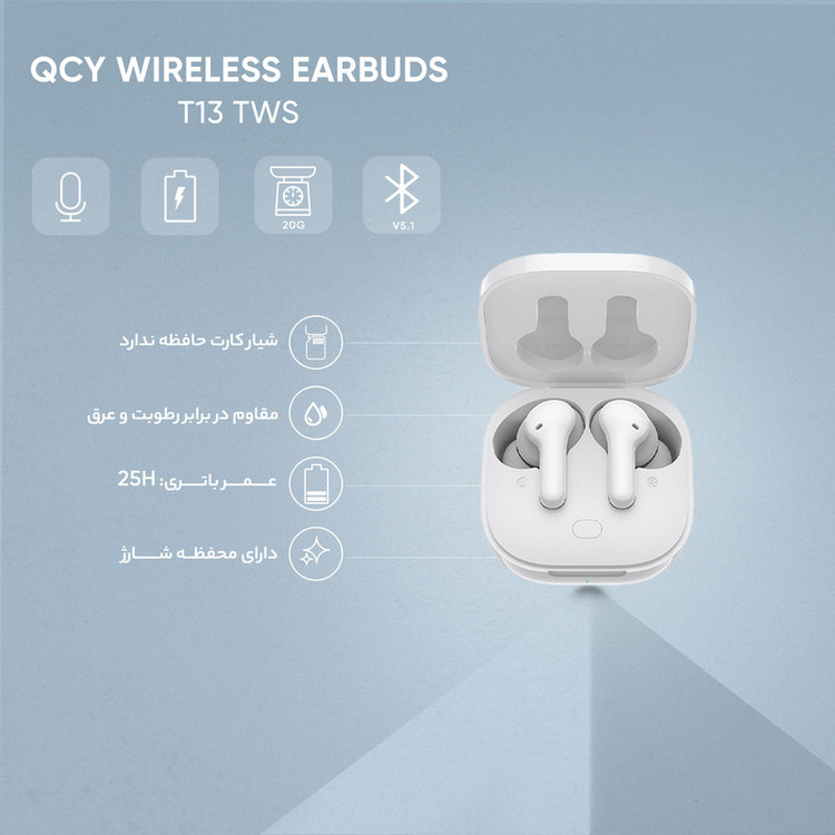 هندزفری بلوتوثی کیو سی وای از طراحی داخل گوش و جذابی بهره میبرد. درایور 7.2 میلیمتری دینامیک آن صدای شفاف و هیجانانگیزی را تولید و ماژول بلوتوث 5.1 اتصال سریع و پایداری را میسر میکند. میکروفونهای این هدفون به فناوری نویز کنسلینگ مجهز شدهاند و امکان مکالمهای شفاف و باکیفیت را برایتان فراهم میکنند. باتری هندزفری و کیس مجموعا 40 ساعت شارژدهی را به کاربر ارائه میدهند. هندزفری بیسیم QCY T13 از طراحی داخل گوش بهره میبرد و با دو رنگ سفید و مشکی به بازار عرضه شده است. شیائومی در طراحی این هندزفری اصول ارگونومی را رعایت کرده است و زاویهای که بین قسمت سری و پایه هندزفری وجود دارد باعث میشود تا به شکل بهتری درون گوش قرار بگیرد. بر روی قسمت پایه هندزفری دو پین طلایی رنگ وجود دارد که برای شارژ باتری مورد استفاده قرار میگیرد. علاوه بر این، برای طراحی کیس شارژ این هندزفری از کپسولهای فضایی الهام گرفته شده است و شاهد خطوط نرم و زبان طراحی مدرن و جذابی هستیم. کیو سی وای در هندزفری T13 از یک باتری با ظرفیت 380 میلیآمپر ساعت برای محفظه شارژ استفاده کرده است که میتواند تا 30 ساعت شارژدهی داشته باشد. همچنین ایرپادها در حالت های مختلف عملکردهای متفاوتی دارند، به طور مثال در حالت پخش صدا تا 8 ساعت و در حالت مکالمه تا 5 ساعت شارژدهی داشته باشد. علاوه بر این شما این امکان را خواهید داشت تنها با 5 دقیقه شارژ به مدت 60 دقیقه از این محصول استفاده کنید. این محصول به اکثر دستگاههای هوشمند از جمله موبایل، تبلت و لپتاپ بهراحتی متصل میشود. هندزفری بلوتوثی کیو سی وای T13 یک انتخاب اقتصادی و بسیار باکیفیت با امکانات رضایتبخش در ردهی قیمتی خود محسوب میشود که ارزش خرید بسیار بالایی خواهد داشت.