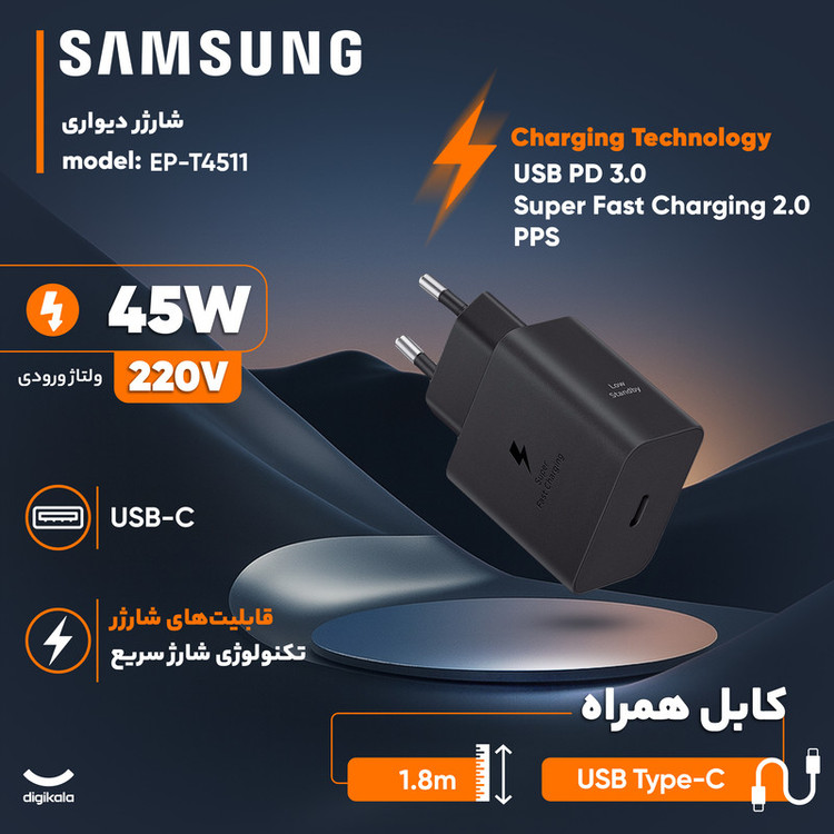 در دنیای امروز که سرعت و کارایی حرف اول را میزند، انتخاب یک شارژر مناسب اهمیت بالایی پیدا کرده است. اگر شما هم یکی از کاربران محصولات سامسونگ هستید، شارژر T4511 سامسونگ 45 وات با کابل میتواند پاسخ مناسبی برای نیازهای شما باشد. این شارژر با پشتیبانی از فناوری شارژ سریع، امنیت بالا و طراحی استاندارد، یکی از بهترین گزینه های موجود در بازار محسوب میشود.